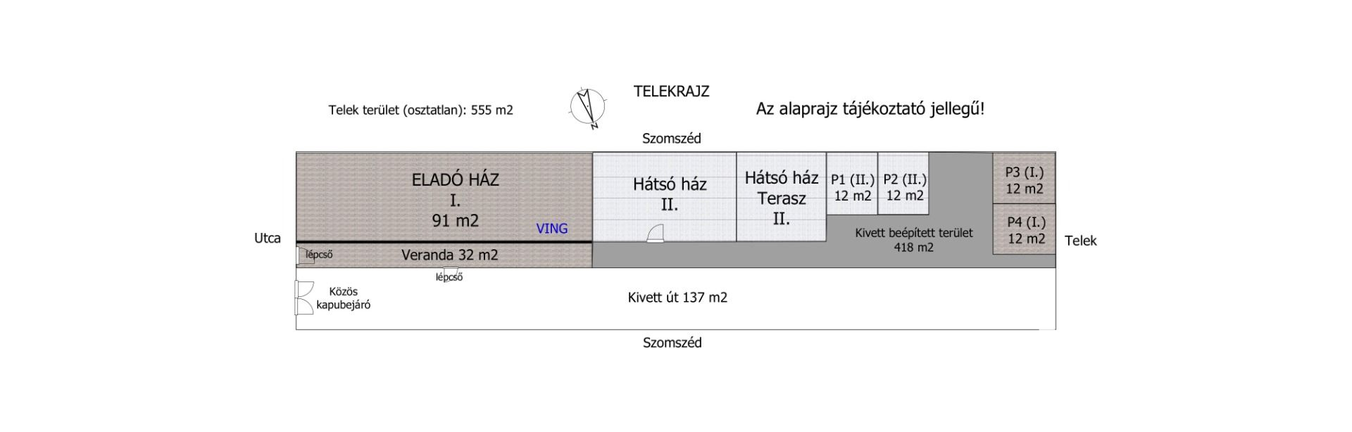 A fenti lakás egy másik lakással együtt közös udvaron található 555 m2-es összközműves telken.
